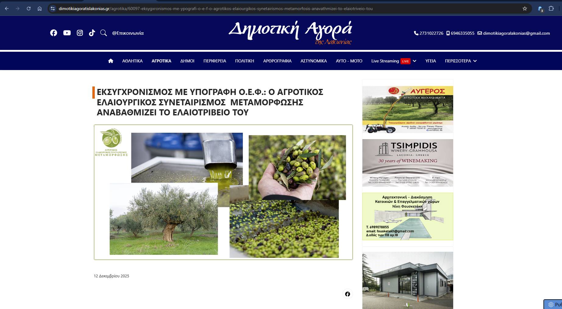 Άρθρο από την ιστοσελίδα “Δημοτική Αγορά της Λακωνίας” με τίτλο: Εκσυγχρονισμός με υπογραφή Ο.Ε.Φ.: Ο Αγροτικός Ελαιουργικός Συνεταιρισμός Μεταμόρφωσης αναβαθμίζει το ελαιοτριβείο του.