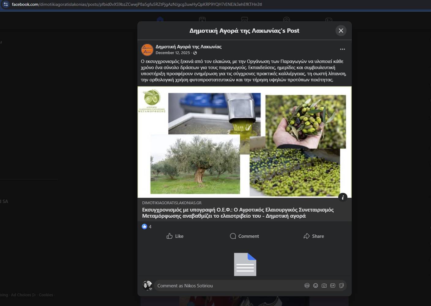 Post που αναρτήθηκε στη σελίδα του Facebook της Δημοτικής Αγοράς της Λακωνίας με τίτλο: Εκσυγχρονισμός με υπογραφή Ο.Ε.Φ.: Ο Αγροτικός Ελαιουργικός Συνεταιρισμός Μεταμόρφωσης αναβαθμίζει το ελαιοτριβείο του.